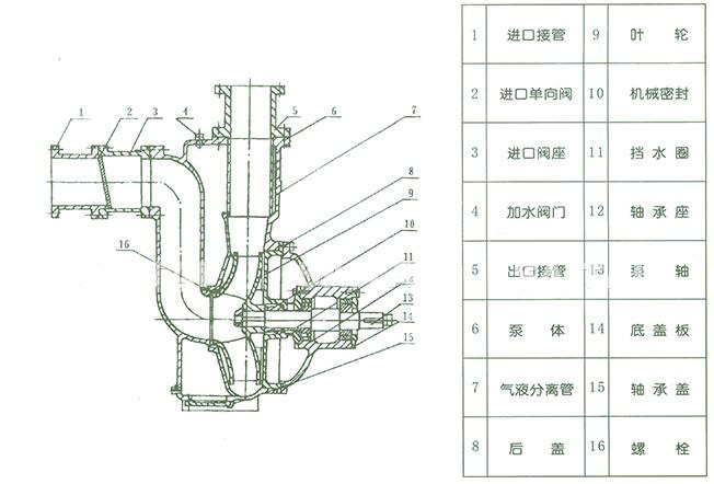 ZW型無堵塞自吸式排污泵主要由泵體、葉輪、后蓋、機(jī)械密封、泵軸、軸承座、進(jìn)口閥、氣液分離管、加水閥門、進(jìn)、排接管等組成。泵的結(jié)構(gòu)見圖。