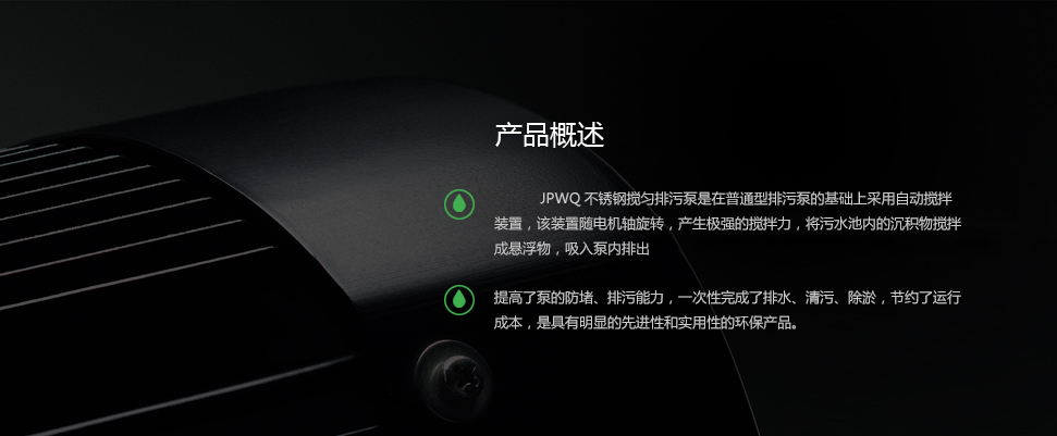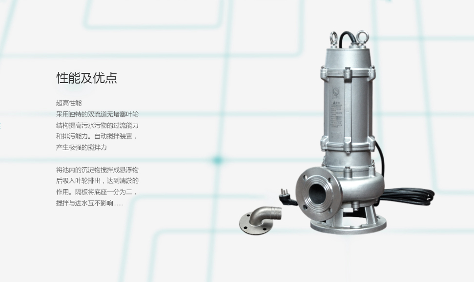 JPWQ不銹鋼攪勻式提升泵是在普通型排污泵的基礎上采用自動攪拌裝置,該裝置隨電機軸旋轉,產生極強的攪拌力,將污水池內的沉積物攪拌成懸浮物,吸入泵內排出,提高了泵的防堵、排污能力,