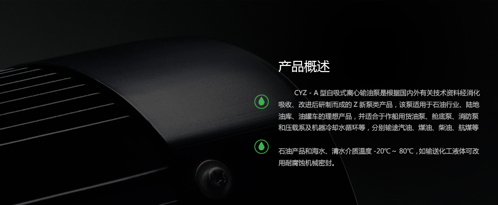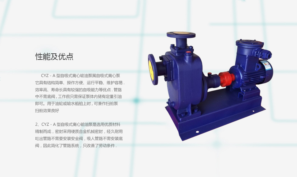 1、CYZ-A型自吸式離心輸油泵屬自吸式離心泵,它具有結(jié)構(gòu)簡單、操作方便、運行平穩(wěn)、維護(hù)容易.效率高、壽命長具有較強(qiáng)的自吸能力等優(yōu)點.管路中不需底閥,工作前只需保證泵體內(nèi)儲有定量引油即可。用于油輪或輸水船舶上時, 可兼作掃艙泵 掃艙效果良好。