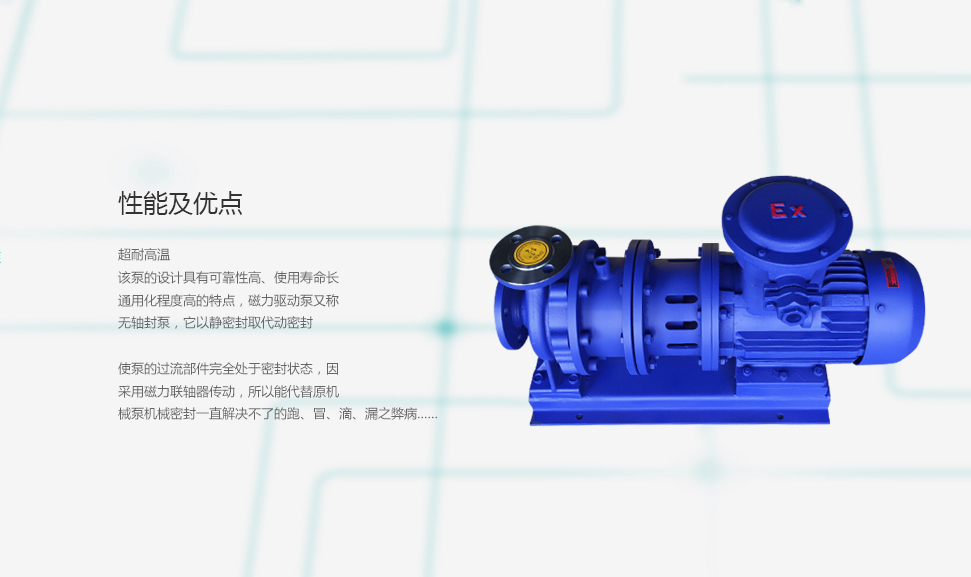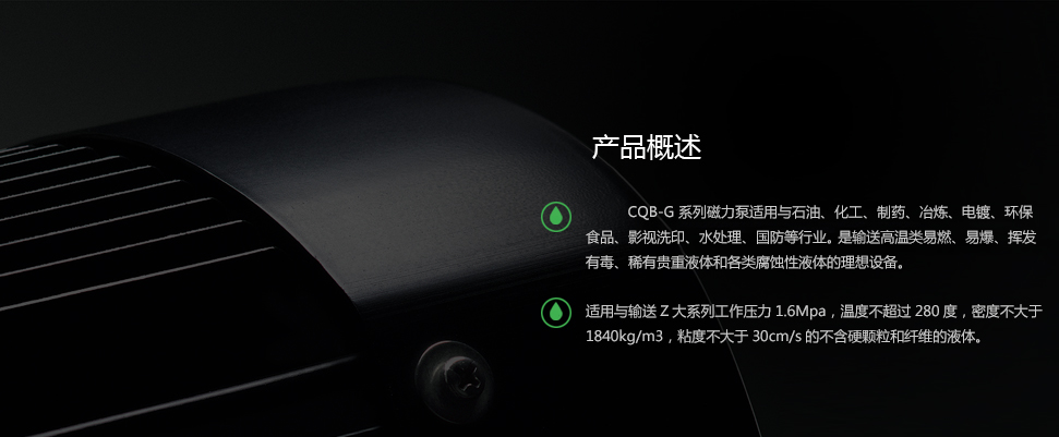 CQB-G 系列磁力泵適用與石油、化工、制藥、冶煉、電鍍、環保、食品、影視洗印、水處理、國防等行業。 是輸送高溫類易燃、易爆、揮發、有毒、稀有貴重液體和各類腐蝕性液體的理想設備。適用與輸送Z大系列工作壓力1.6Mpa,溫度不超過280度,密度不大于1840kg/m3,粘度不大于30cm/s的不含硬顆粒和纖維的液體。