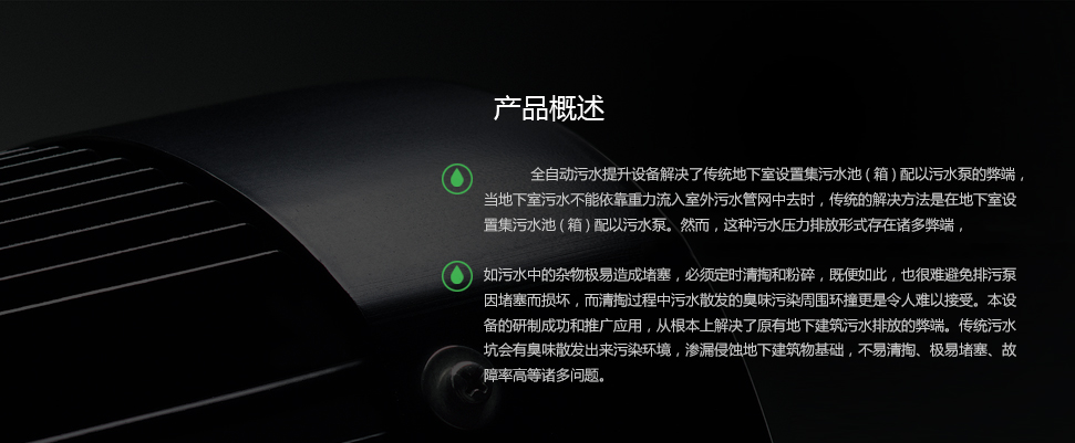 6、全自動智能控制:采用全智能控制技術(shù),手動、自動轉(zhuǎn)換,降低了人工控制的難度和強度。獨有設(shè)計模式保證各種使用環(huán)境中污水提升設(shè)備的正常安全運行工作,并具有報警提示功能,保證用戶使用的連續(xù)性;
