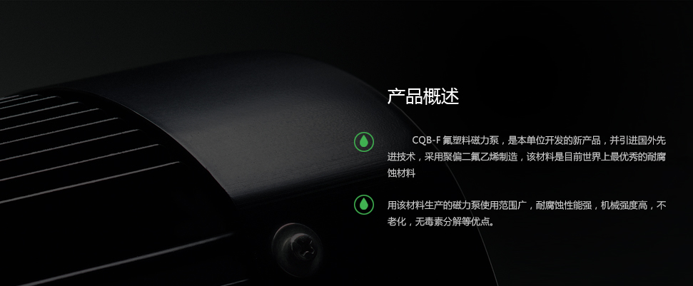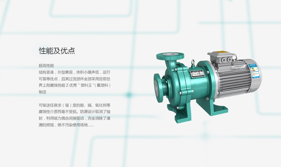 CQB-F氟塑料磁力泵的設計不僅具有普通磁力泵的結構緊湊,外型美觀,體積小,躁聲低,運行可靠等優點,且其過流部件全部采用目前世界上耐腐蝕性能Z優秀“塑料王”(氟塑料)制造,隔離套采用特殊材料制造,具有高強度的力學性能,消除了普通磁力泵 存在的磁渦流現象。因此,CQB-F氟塑料磁力泵可輸送任意濃(強)度的酸、堿、氧化劑等腐蝕性介質而毫不受損。防漏設計取消了軸封,利用磁力偶合間接驅動,完全消除了滴漏的煩惱,絕不污染使用場地。