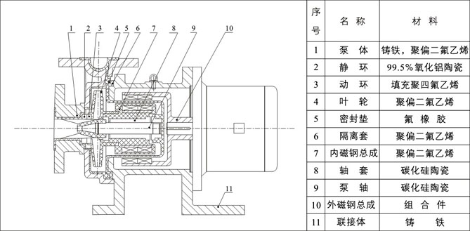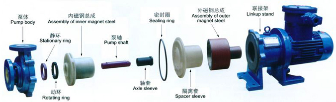 驅動裝置采用主動磁鐵聯軸器直接裝在電機軸上,泵室完全封閉,通過磁力偶合間接驅動泵軸上帶磁鐵的葉輪旋轉結構緊湊、安全節能。堅固耐用的泵體結構雖然接觸液體部分是氟塑料,但泵外殼是金屬材料,故泵體足以承受管道的重量及抵受機械性沖擊,氟塑料磁力泵由泵、磁力傳動器、電動機三部分組成。關鍵部件磁力傳動器由外磁轉子、內磁轉子及不導磁的隔離套組成。當電動機帶動外磁轉子旋轉時,磁場能穿透空氣隙和非磁性物質,帶動與葉輪相連的內磁轉子作同步旋轉,實現動力的無接觸傳遞,將動密封轉化為靜密封。由于泵軸、內磁轉子被泵體、隔離套完全封閉,從而徹底解決了“跑、冒、滴、漏”問題,消除了煉油化工行業易燃、易爆、有毒、有害介質通過泵密封泄漏的安全隱患,有力地保證了職工的身心健康和安全生產。