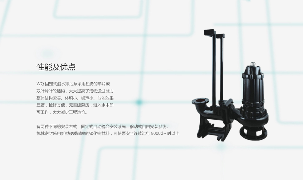 3.WQ固定式潛水排污泵整體結構緊湊、體積小、噪聲小、節(jié)能效果顯著,檢修方便,無需建泵房,潛入水中即可工作,大大減少工程造價。