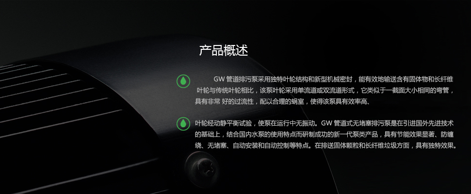GW管道排污水泵是在引進國外先進技術的基礎上,結合國內(nèi)水泵的使用特點而研制成功的新一代泵類產(chǎn)品,具有節(jié)能效果顯著、防纏繞、無堵塞、自動安裝和自動控制等特點。在排送固體顆粒和長纖維垃圾方面,具有獨特效果